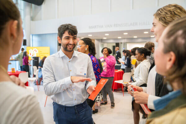 College of Engineering student Aryaman Anupam Thareja ’25 chats with other contributors and guests attending the 2023 Contribution Project Student Showcase in the Human Ecology Commons. (Photo: Darcy Rose)